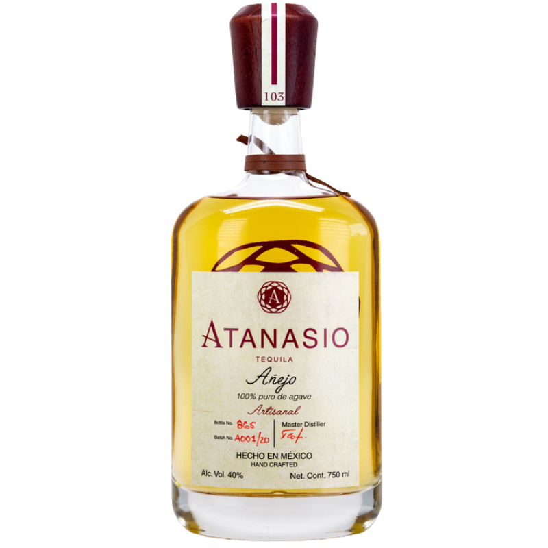 Atanasio Añejo is a tequila created by Francisco Jimenez, distilled at Familia Landeros S.C. de R.L. de C.V. in Lowlands/El Valle, Tequila. It is cooked in Autoclave (low pressure) and crushed using a Roller Mill. The type of fermentation is Closed tank, and the spirit is distilled in Pot Still. Bottled at NOM #1599 with 100% agave, it is released at 38% abv (76 proof), 40% abv (80-proof).