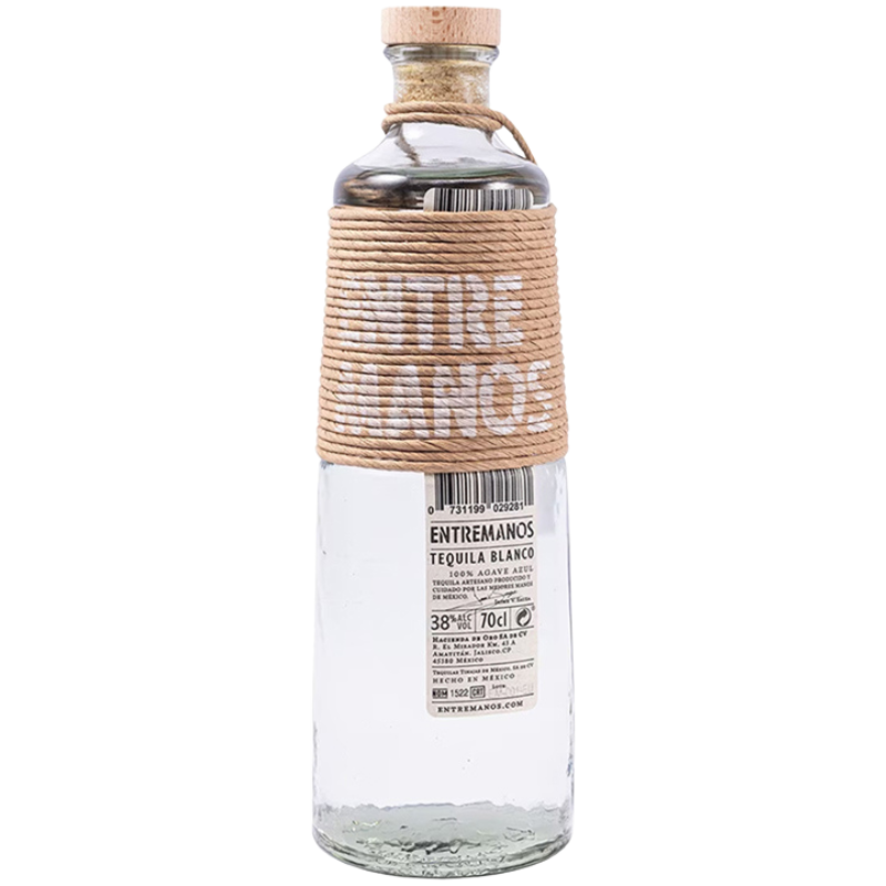 Entremanos Tequila Blanco is a tequila created by Jaime Villalobos Sauza, distilled at Gold Estate, S.A. de C.V. in Lowlands/El Valle, Amatitan. It is cooked in Autoclave (high pressure) and crushed using a Roller Mill. The type of fermentation is Open-air fermentation, and the spirit is distilled in Pot Still. Bottled at NOM #1522 with 100% agave, it is released at 38% abv (76 proof).